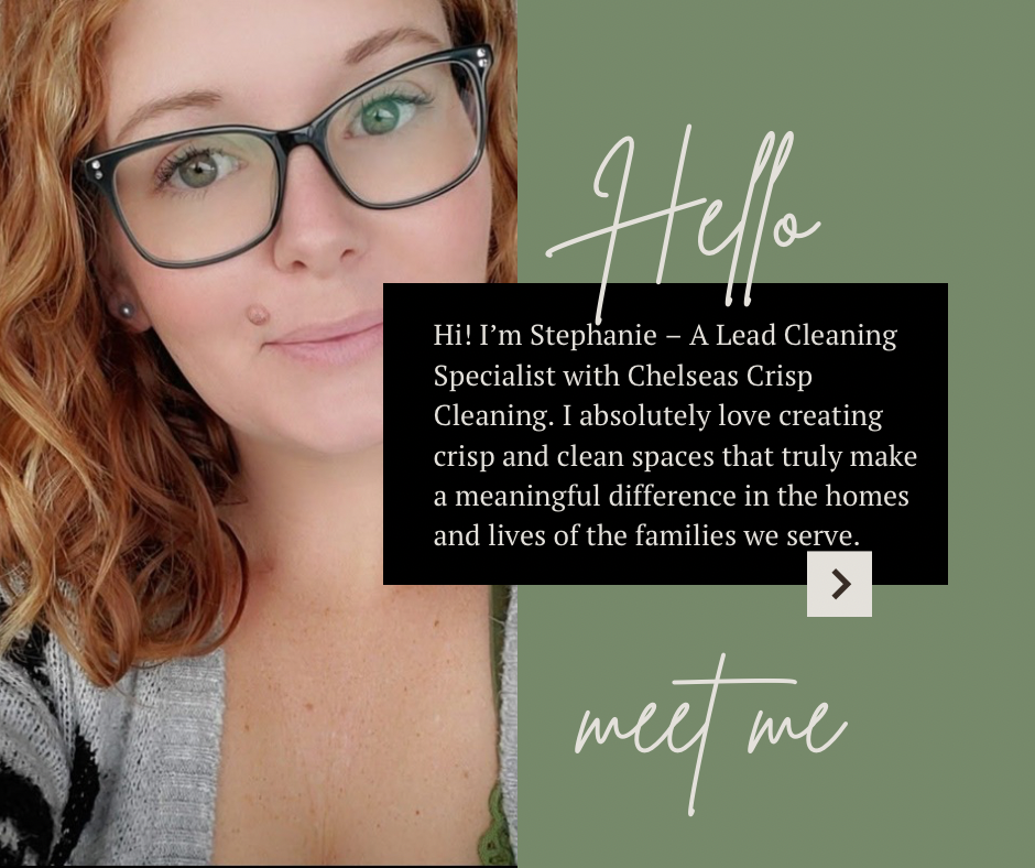 Hi! I’m Stephanie– A Lead Cleaning Specialist with Chelsea’s Crisp Cleaning. I take deep pride in the work I do because I know a clean, organized home can bring so much peace and clarity to a family’s daily life. Whether I’m doing a quick upkeep or a detailed deep clean, I always bring care, attention to detail, and a commitment to excellence.